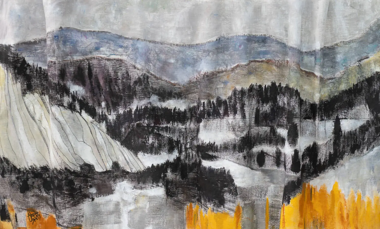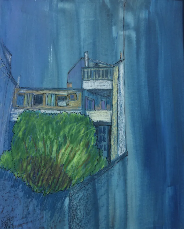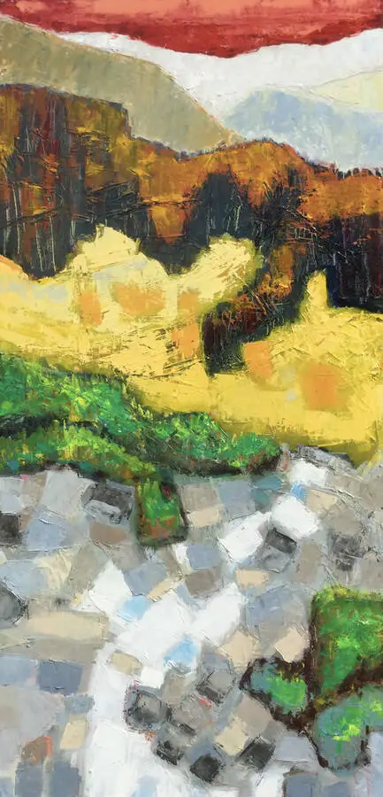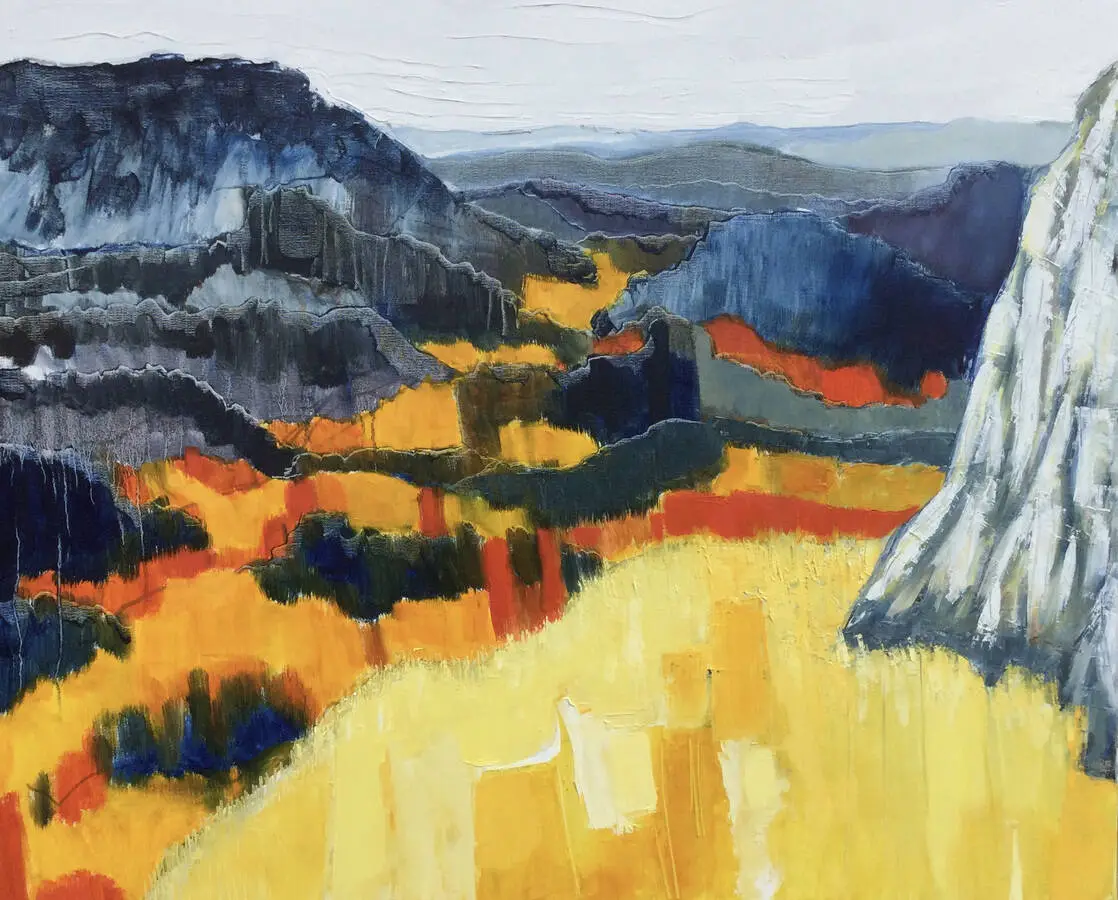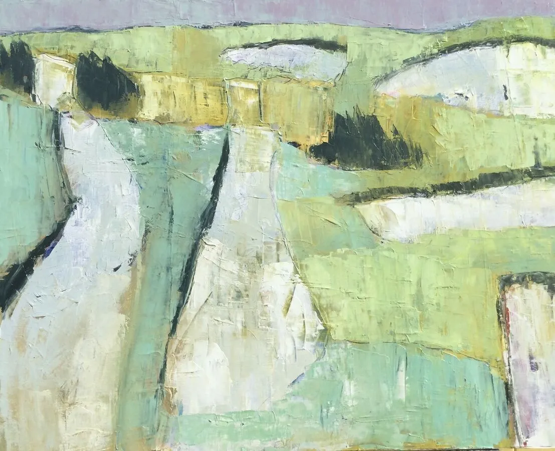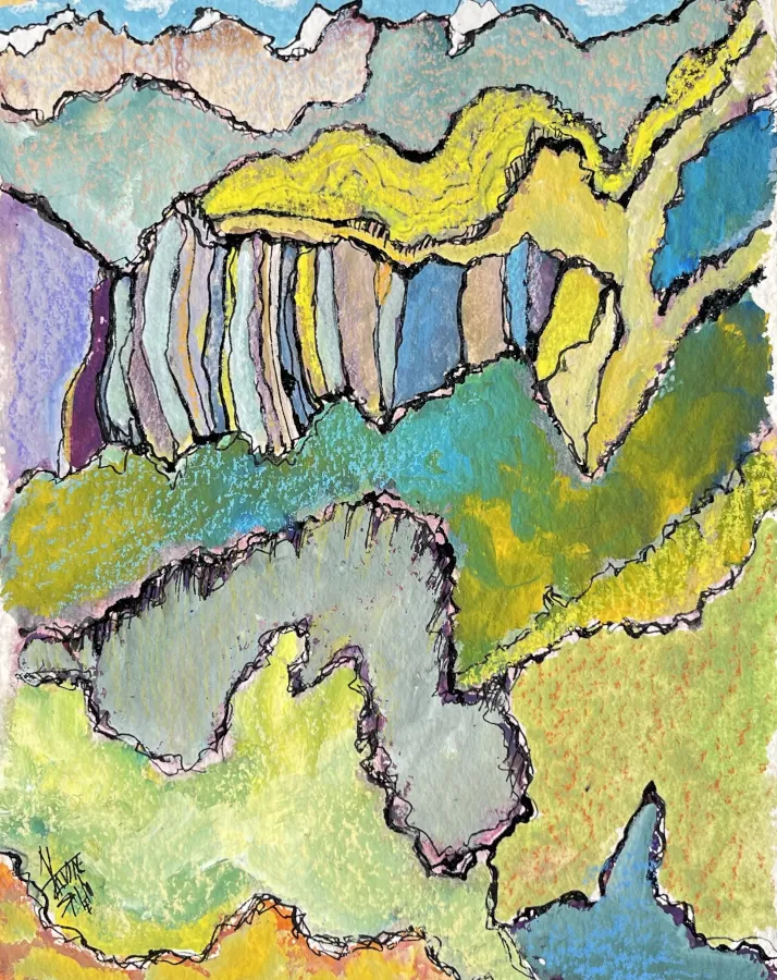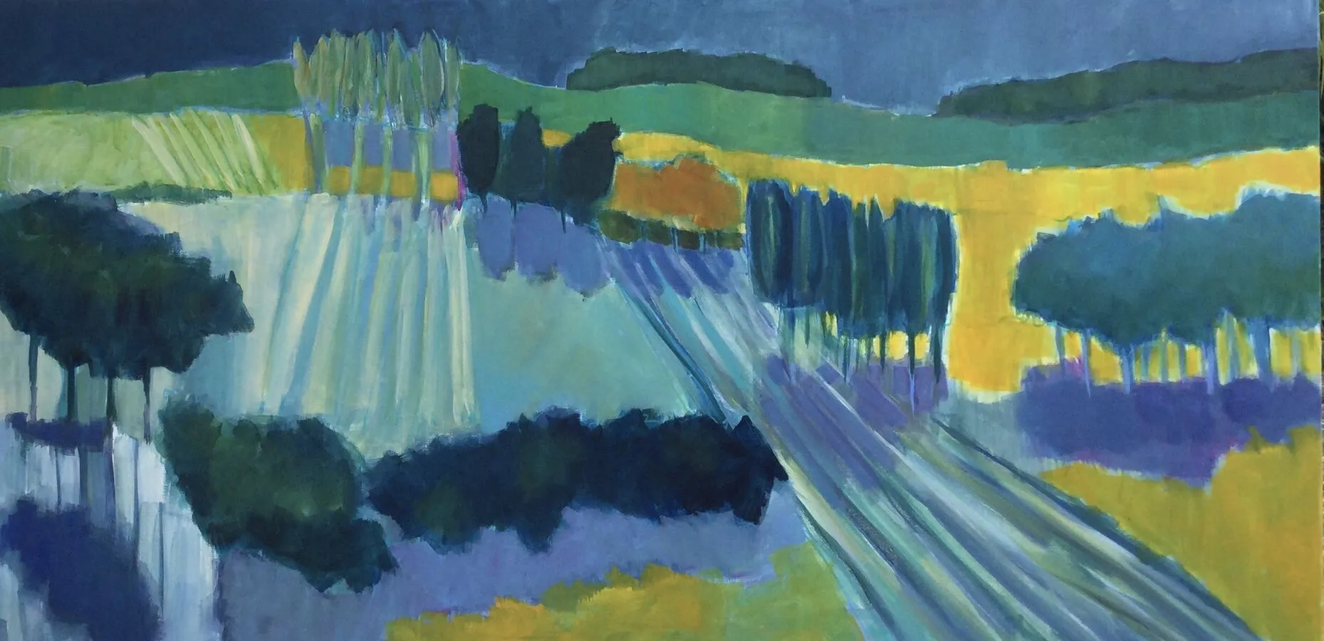 Nadine travaille en couches souples et en superpositions légères. C’est ainsi qu’elle module la matière. Puis elle ajoute des reprises plus denses, héritées de la peinture à l’huile.